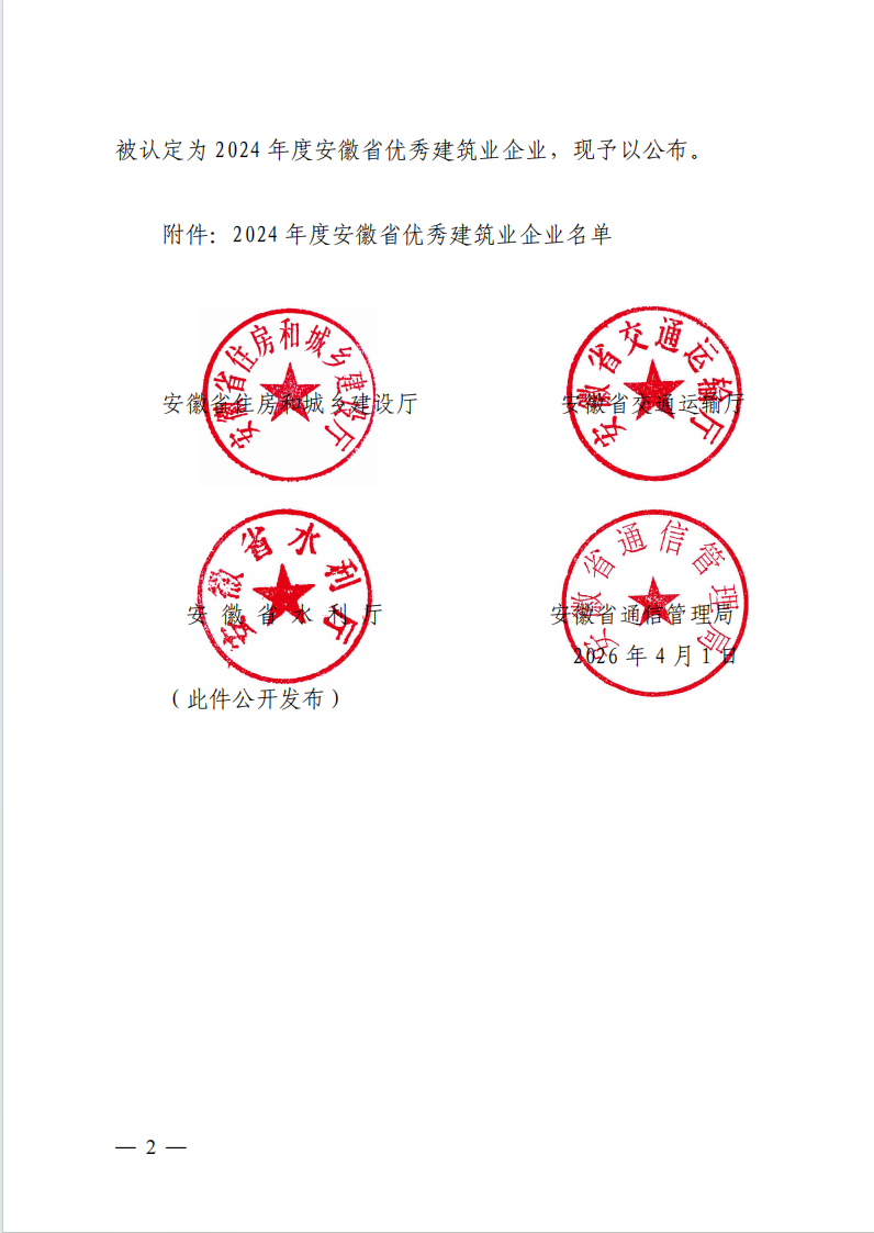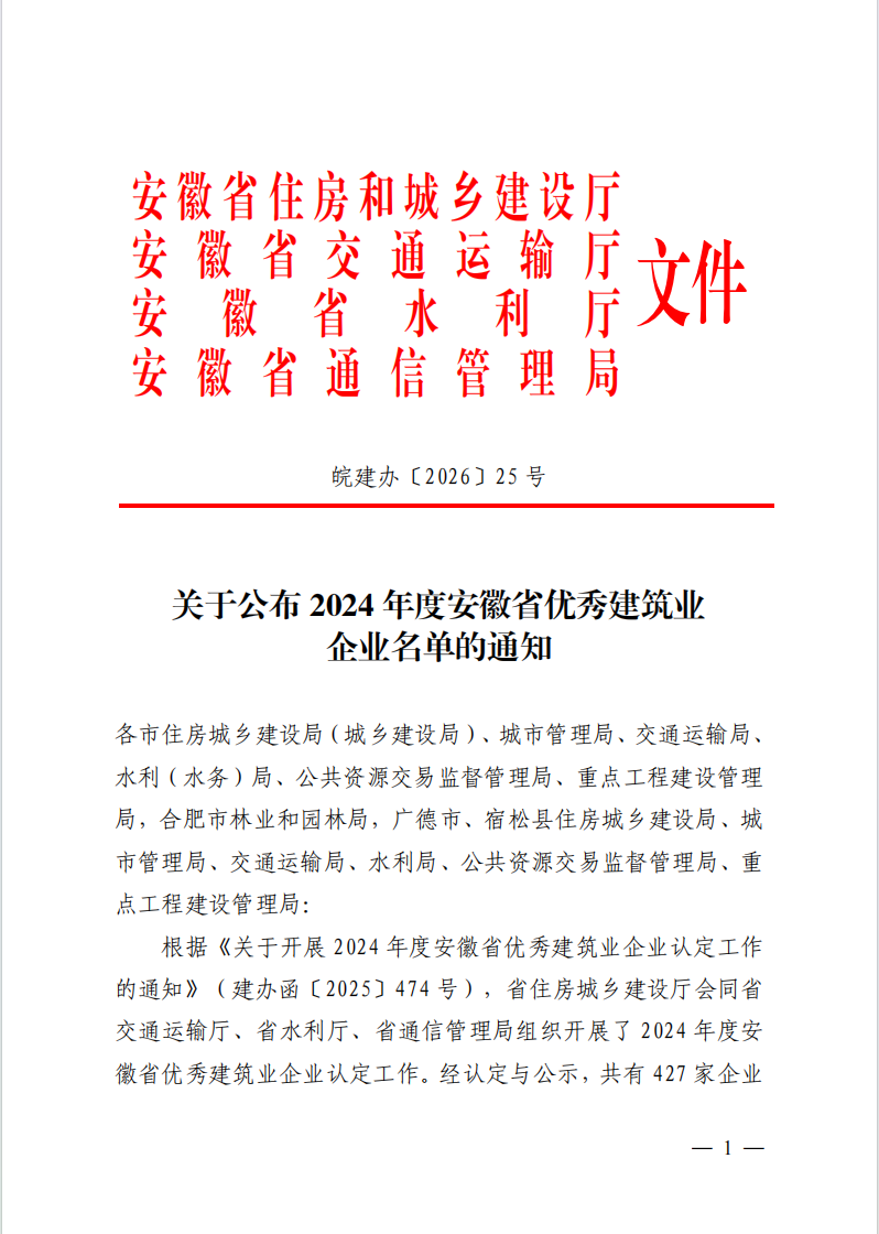 喜报!安徽中望建设工程有限公司获得“安徽省优秀建筑业企业”喜报!安徽中望建设工程有限公司获得“安徽省优秀建筑业企业” 近日,安徽省住房建设厅会同省交通运输厅、省水利厅、省通信管理局联合公布 2024年度安徽省优秀企业认定结果,安徽中望建设工程有限公司连续四年成功入选。